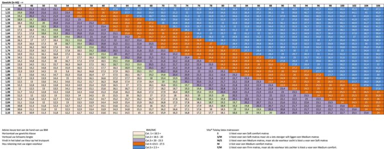 Deze tabel geeft een wetenschappelijke onderbouwing weer, van de relatie tussen gewicht/lichaamslengte en daar uit komt het BMI (Body-Massa-Index cijfer), welke gekoppeld is aan een kleur, die u een advies geeft omtrent uw comfort keuze.
